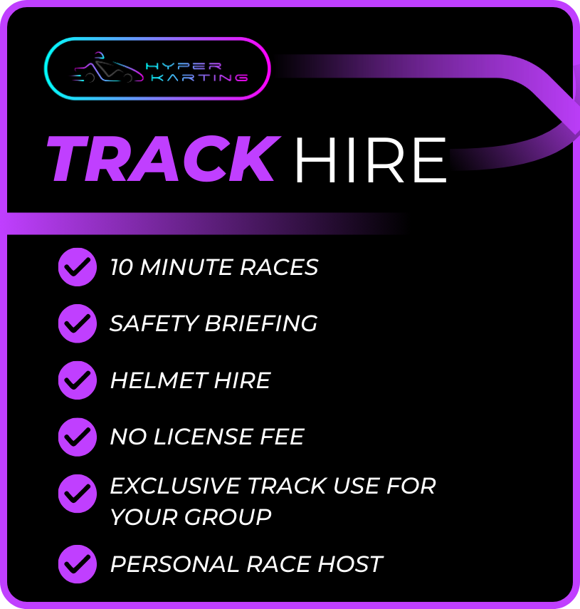 Our Track Hire option gives your group exclusive access to the Hyper Karting Track and a personal race host! You will have the capacity to have up to 16 people race exclusively per 10 minute session. Groups larger than 16 will be split into smaller groups!