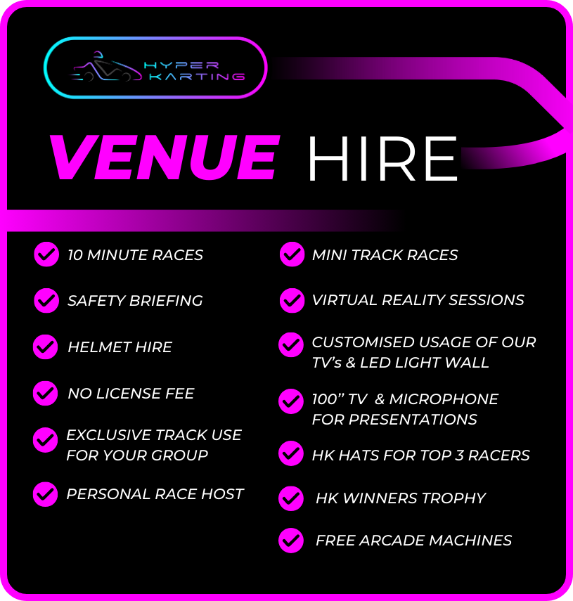 Hyper Karting Venue Hire is the ultimate way to enjoy your experience at Hyper Karting. It is recommend for groups from 20-500 people and allows full access to everything Hyper Karting has to offer!
